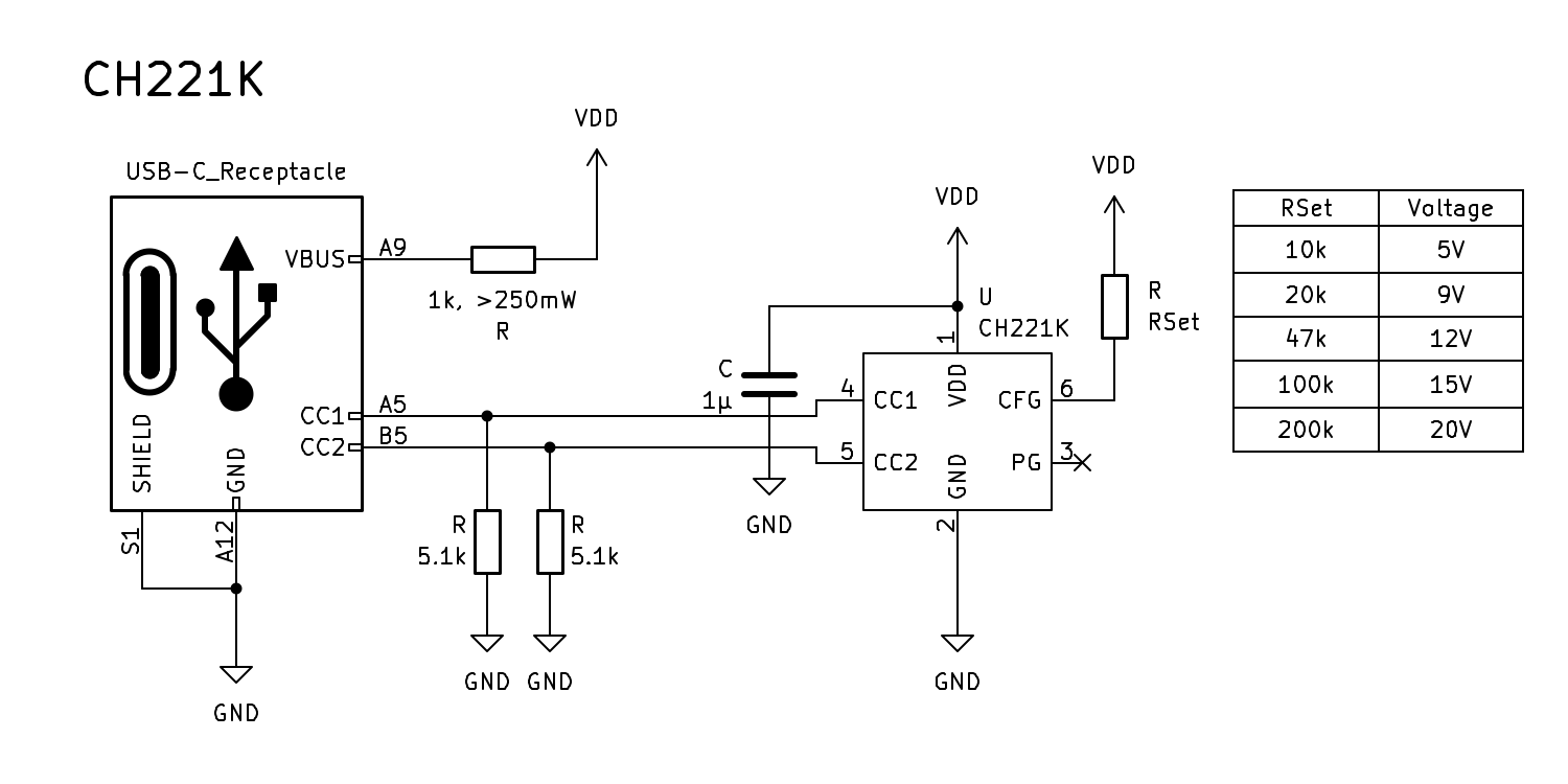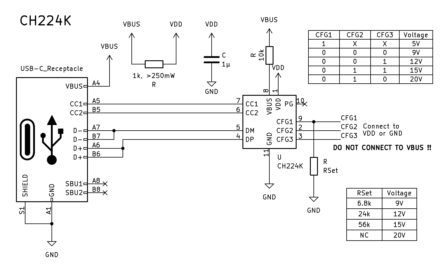 CH224はUSB PDのシンクコントローラーで、簡単な回路でUSB充電器から5Vを超える電圧を取り出すことができます。